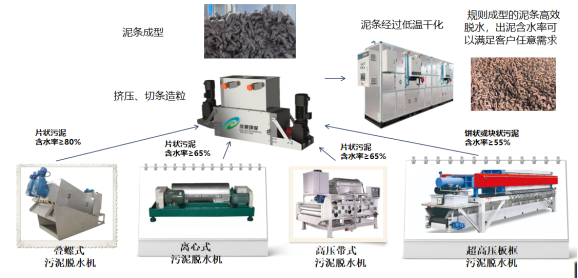 污泥切條為污泥烘干處置工藝中必不可少的一項工序,污泥切條成型,一方面增加污泥與空氣接觸的表面積,使污泥中的水分快速分離出來,提高污泥干化速度,降低能耗。另一方面厚度均勻且成型的泥條,不容易粘連堵塞烘干網(wǎng)帶,降低網(wǎng)帶的清理維護成本。污泥切條機為污泥處置生產(chǎn)線運作生產(chǎn)出了厚度均勻且成型的污泥條,實現(xiàn)了整個產(chǎn)線設(shè)備的節(jié)能,污泥脫水等目標。